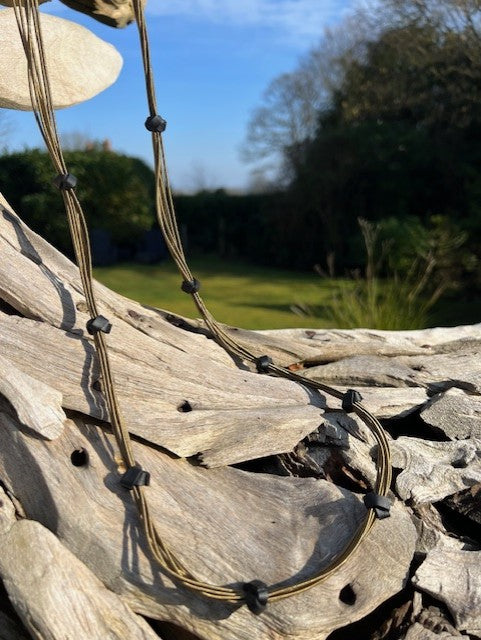 Spring wire necklace with leather knot detail, lightweight and very comfortable to wear