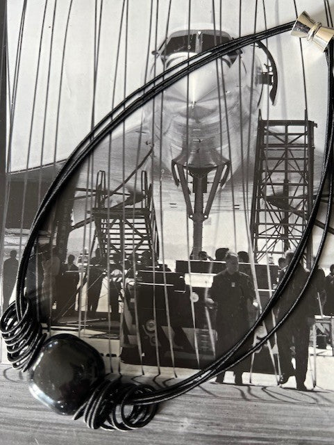 Black spring wire necklace with black ceramic bead and spring wire circles detail, with a magnetic fastening. lightweight and comfortable to wear