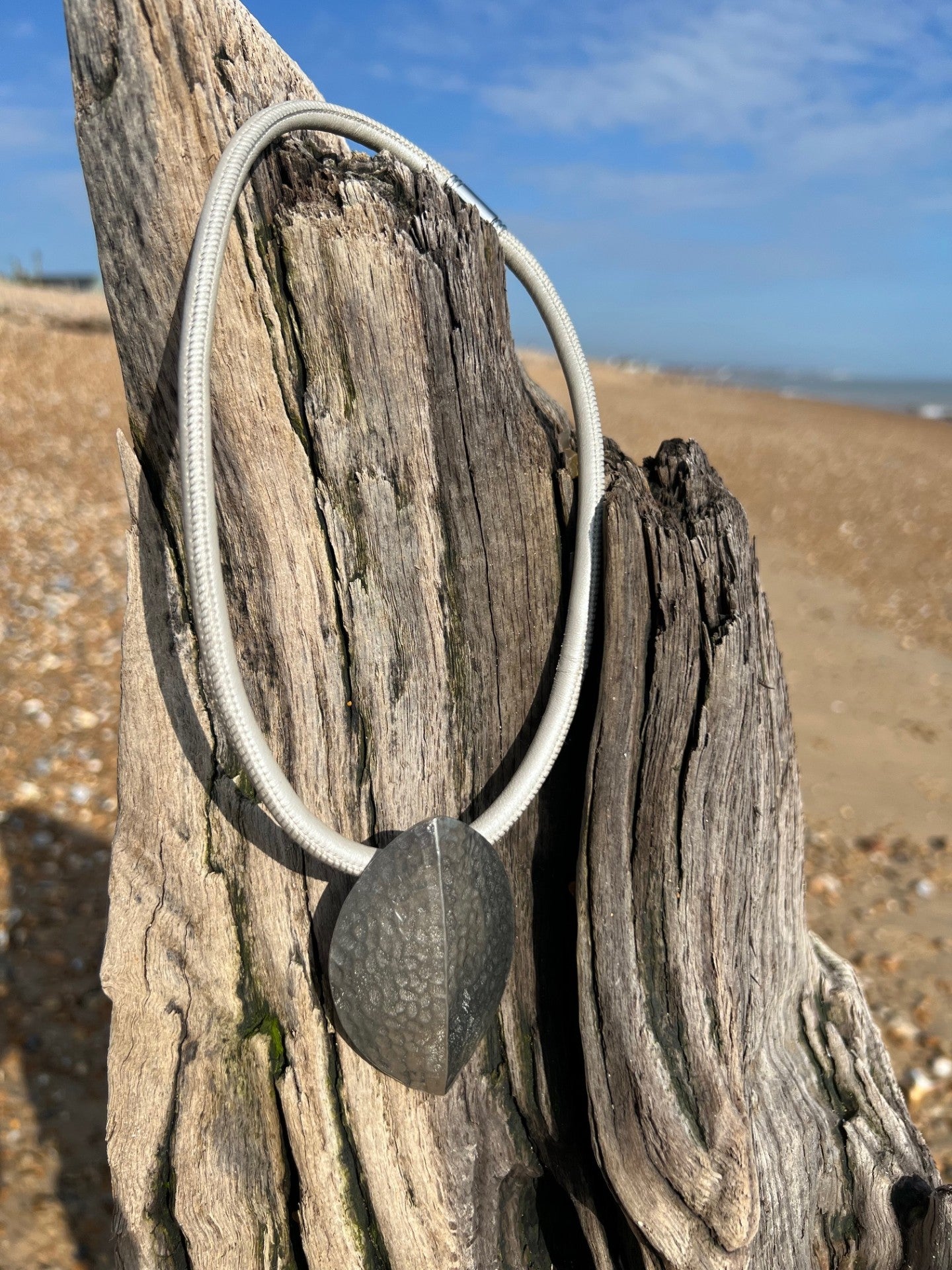 Pewter shield hammered pendant on light grey nappa leather with a magnetic fastening